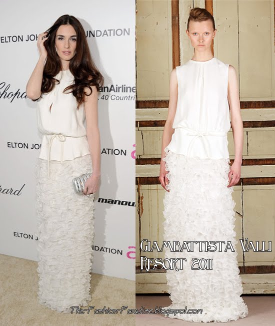 Paz Vega estaba muy guapa con este vestido blanco, con la falda llena de pequeños volantes, de Giambattista Valli Resort 2011. Llevó un minaudière plateado de Salvatore Ferragamo.