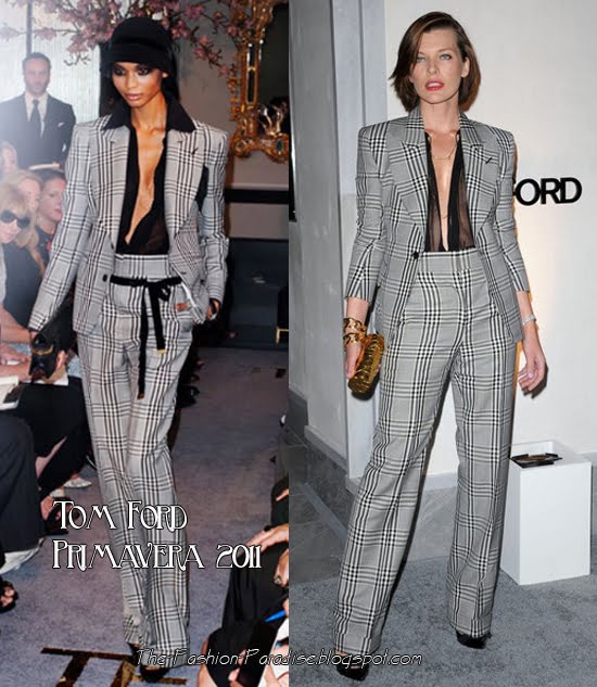 Milla Jovovich llevó un traje gris, con estampado de cuadros, y blusa semitransparente, de Tom Ford Primavera 2011.